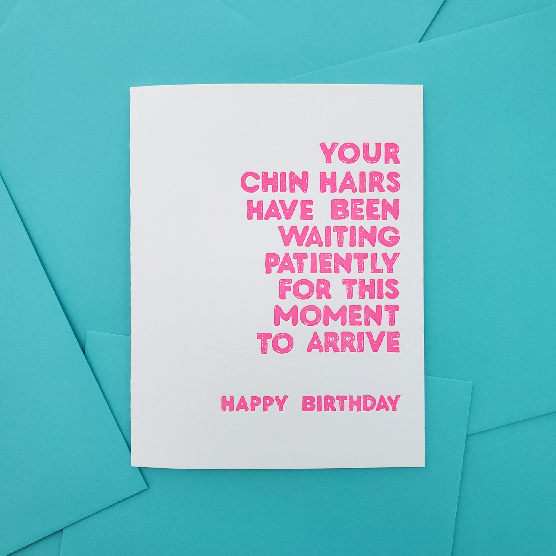 - one color letterpress card A2 size 4.25 x 5.5" cotton paper, neon pink ink with blueberry envelope printed in our Long Beach, CA