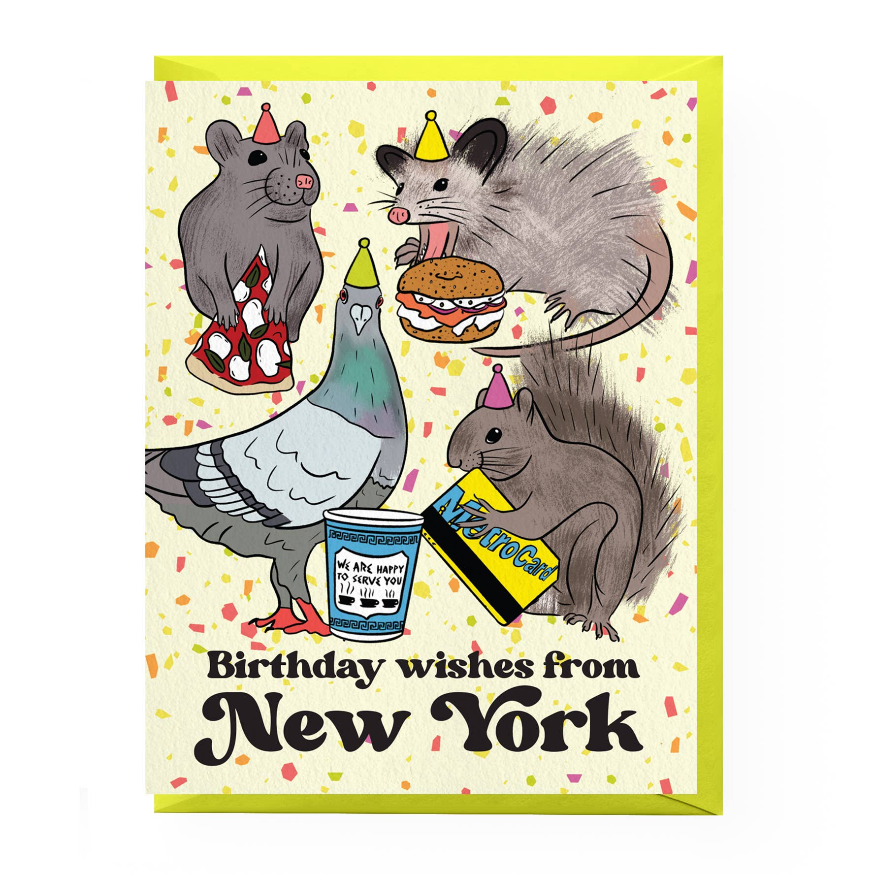 Card reads "Birthday Wishes From New York" and features illustrations of a pizza-loving rat, a pigeon with a coffee cup, a squirrel with a metrocard, and a possum feasting on a bagel.