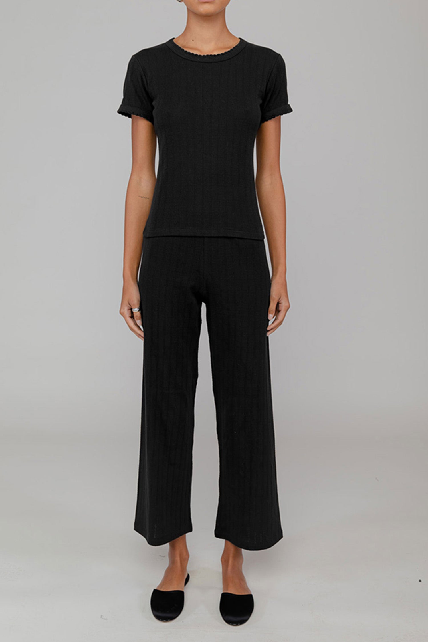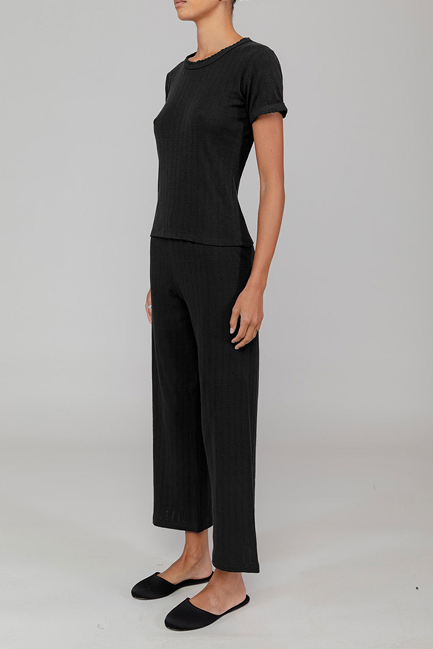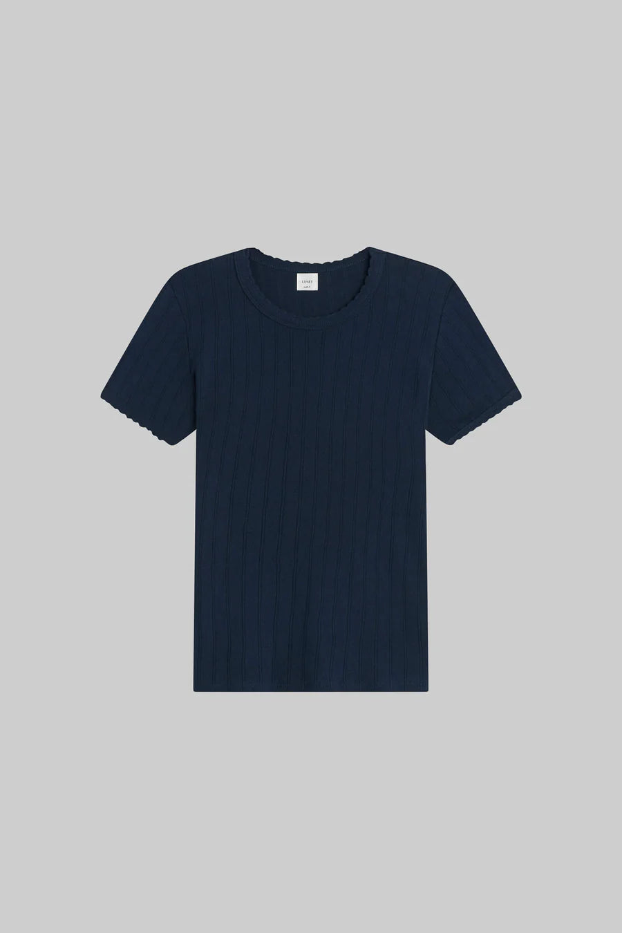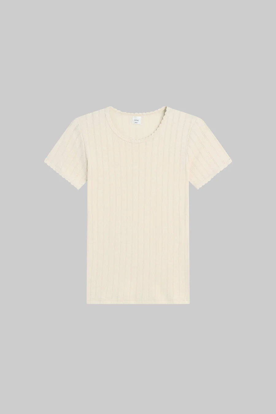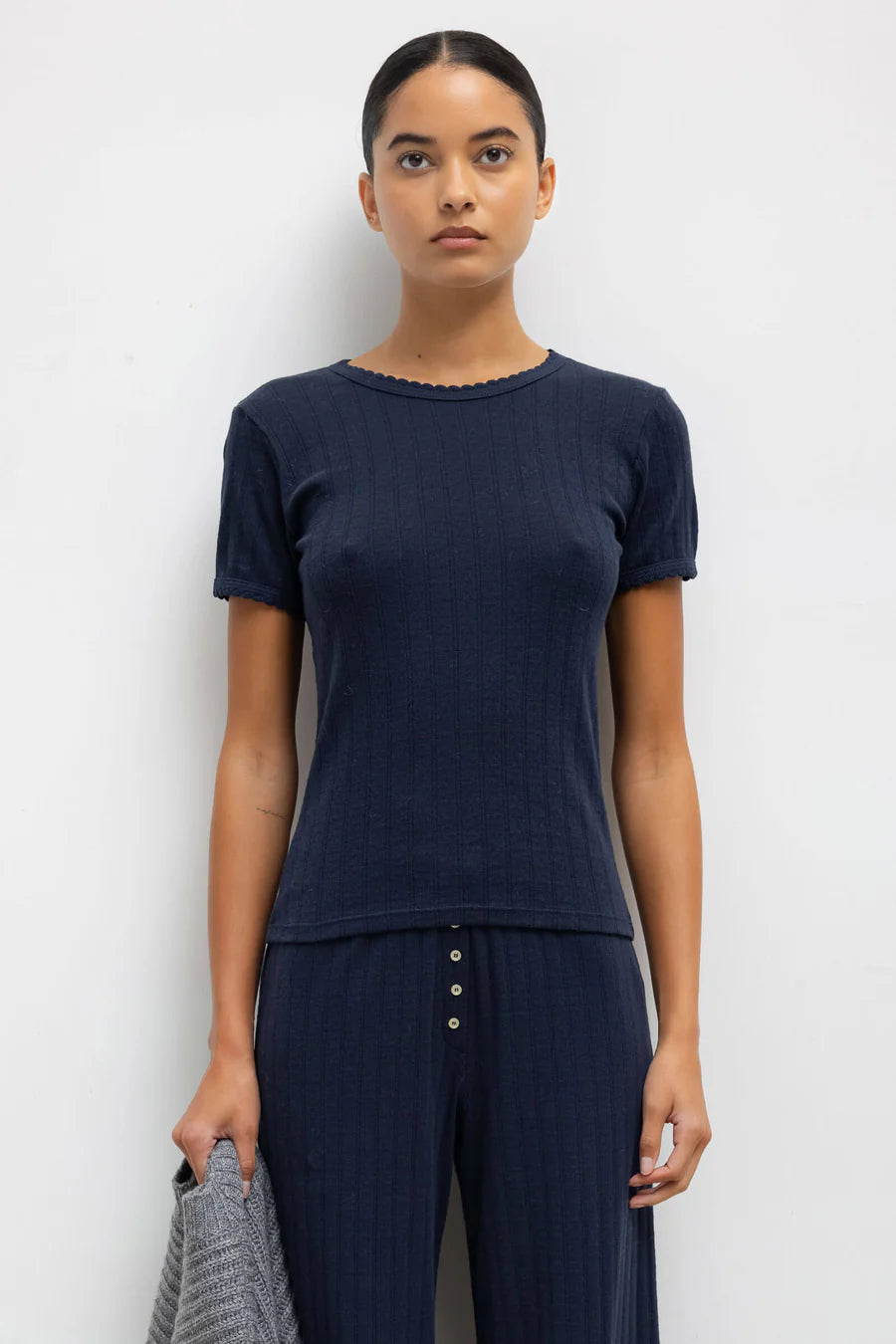 - the Pointelle Slim Fit Tee features classic lingerie inspired details - pinhole stripes, eyelets and scalloped edges