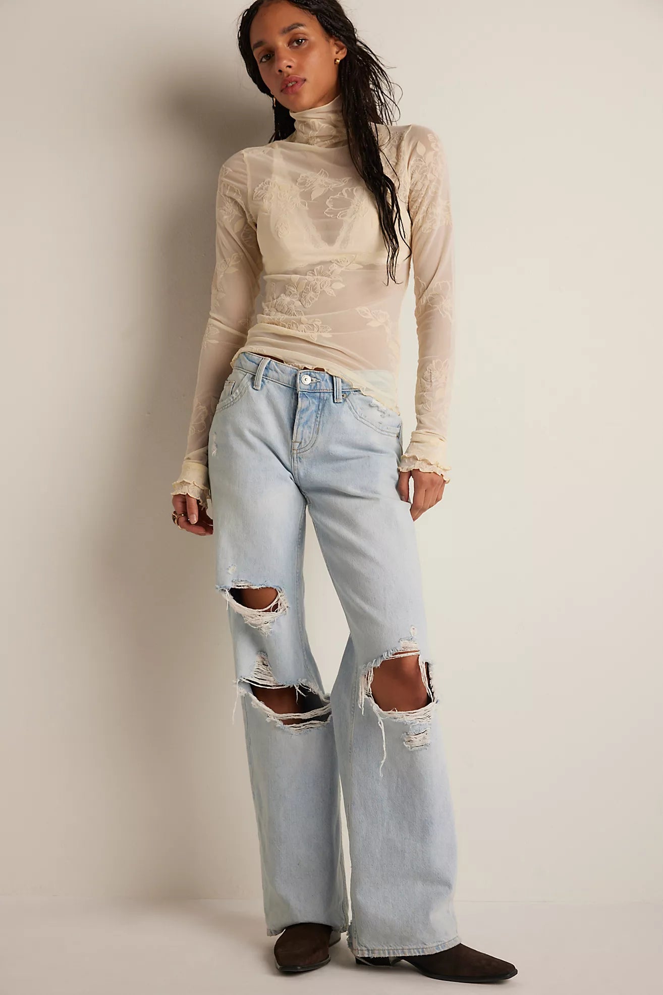- Edgy and perfect for layering, this long sleeve from Intimately features a sheer mesh fabrication, a mock neck design, and a lettuce trim for an added dimension.